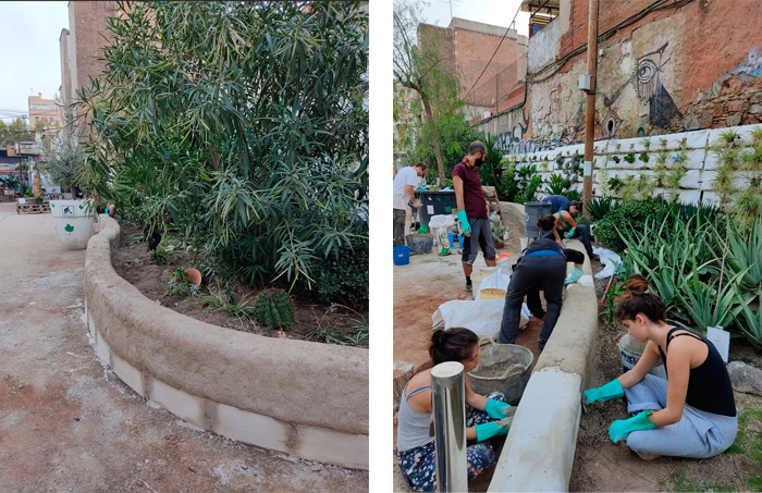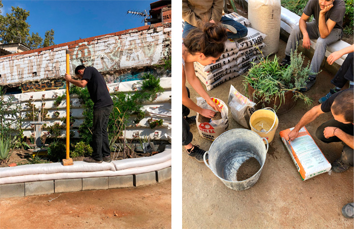 Como resultado, se decidió realizar dos intervenciones, una cubierta de madera quemada y una jardinera de superadobe y revestimientos de cal. Estas intervenciones se llevaron a cabo a través de dos talleres abiertos de tres días cada uno, donde las vecinas y personas interesadas en aprender las técnicas de bioconstrucción participaron en materializarlas.